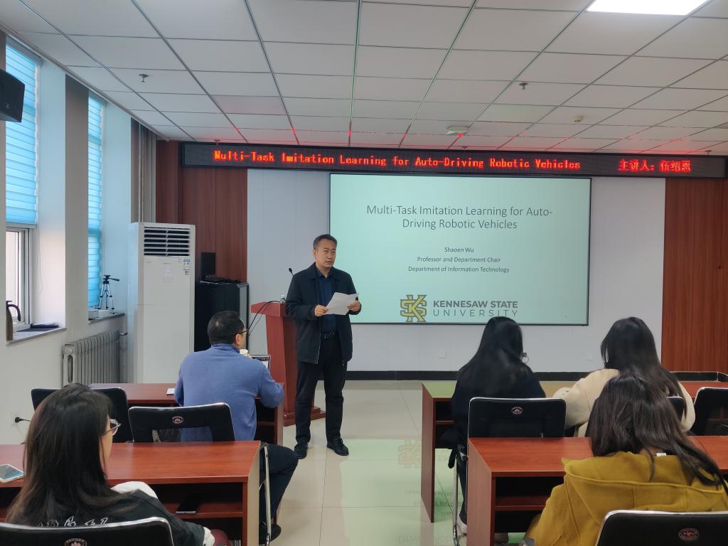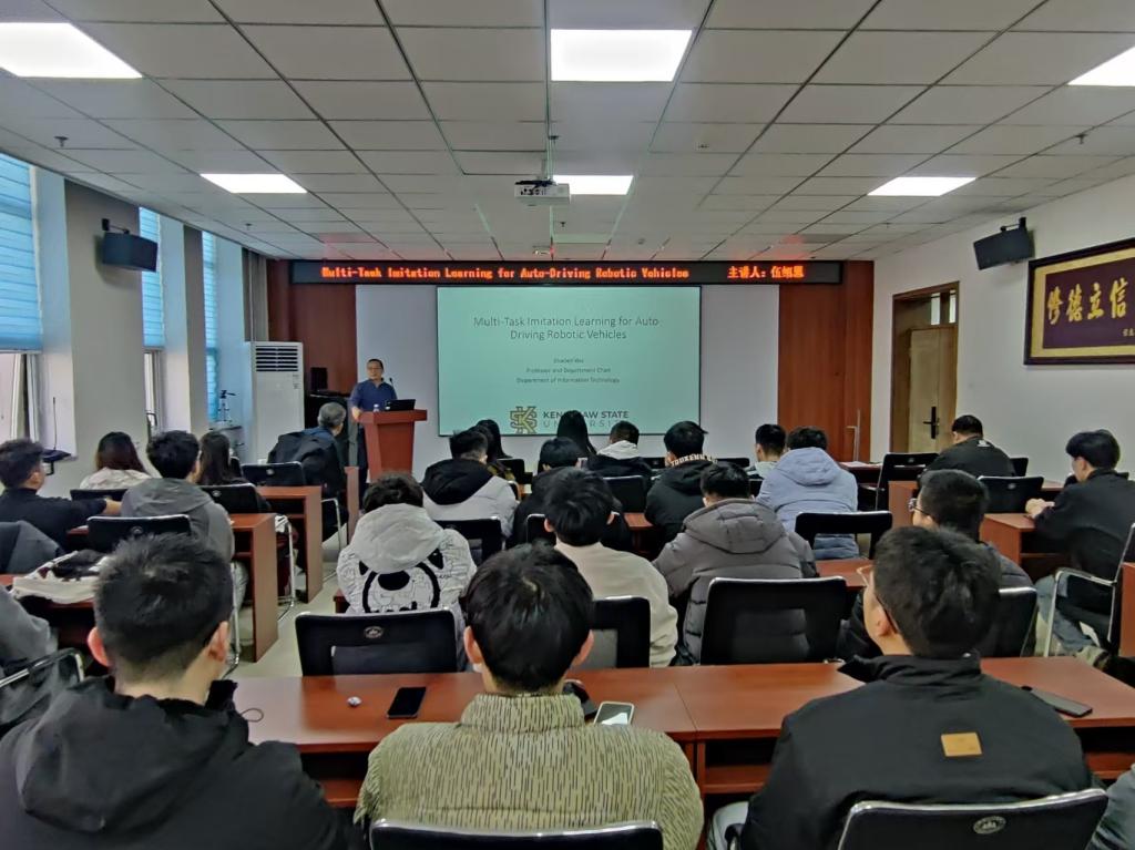 在科学楼B座715会议室成功举办了研究生第20240510期华彩讲坛。本次讲坛邀请了肯尼索州立大学的伍绍恩教授主讲,题为《Multi-Task Imitation Learning for Auto-Driving Robotic Vehicles》,讲座由李凯教授主持,学院广大教师和研究生积极参与了此次讲座。