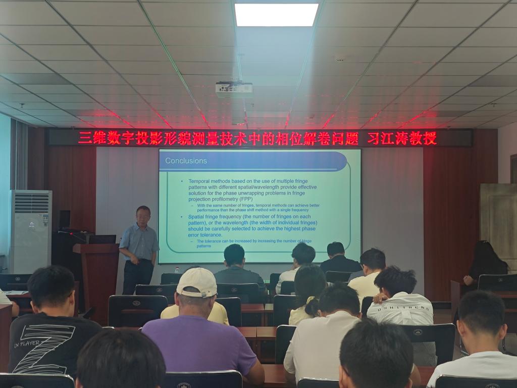 在科学楼B座715会议室成功举办了研究生第20250504期华彩讲坛。学院邀请澳大利亚伍伦贡大学工程与信息科学学部副部长习江涛教授主讲,题为《三维数字投影形貌测量技术中的相位解卷问题》,讲座由孙豫峰书记主持,学院广大教师和研究生积极参与了此次讲座。