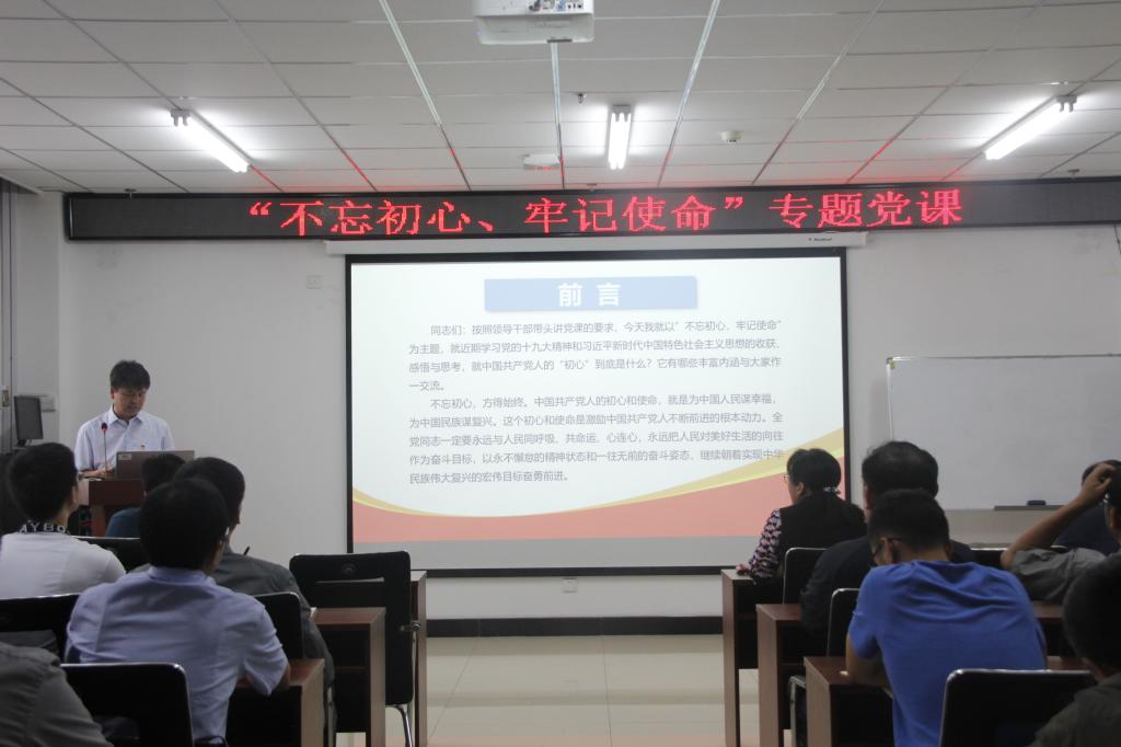 在科学楼715会议室召开了“不忘初心、牢记使命”主题教育活动动员大会暨专题党课培训。参加会议的有院党委领导班子成员、各党支部书记、教工党员、学生党员。