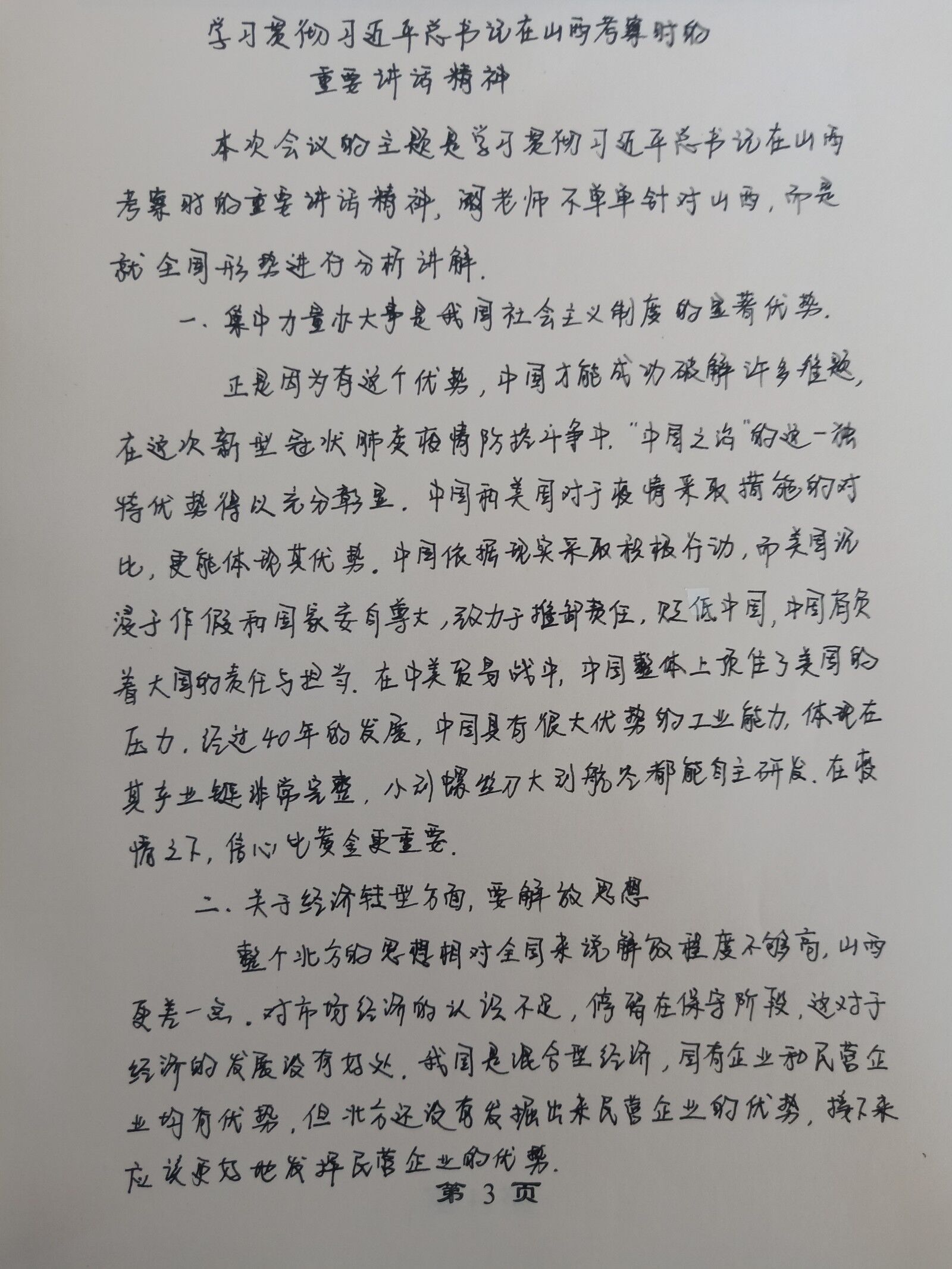首先,阚老师以中印在教育、经济方面的对比;中美疫情防控措施和态度的对比;中美贸易战;通信基站建设等为例,客观形象地分析了中国发展速度如此之快的原因,关键因素是中国特色社会主义制度的优越性使我国率先走在了发展中国家的前列。习近平总书记在视察山西重要讲话中强调,新形势下要切实增强党内政治生活的政治性、时代性、原则性和战斗性。我们要按照习近平总书记的要求,紧紧抓住理想信念这个根本,增强“四个意识”、坚定“四个自信”,把讲政治贯穿于党性锻炼和开展工作全过程,坚决以习近平新时代中国特色社会主义思想为指引,坚定不移走中国特色社会主义道路。