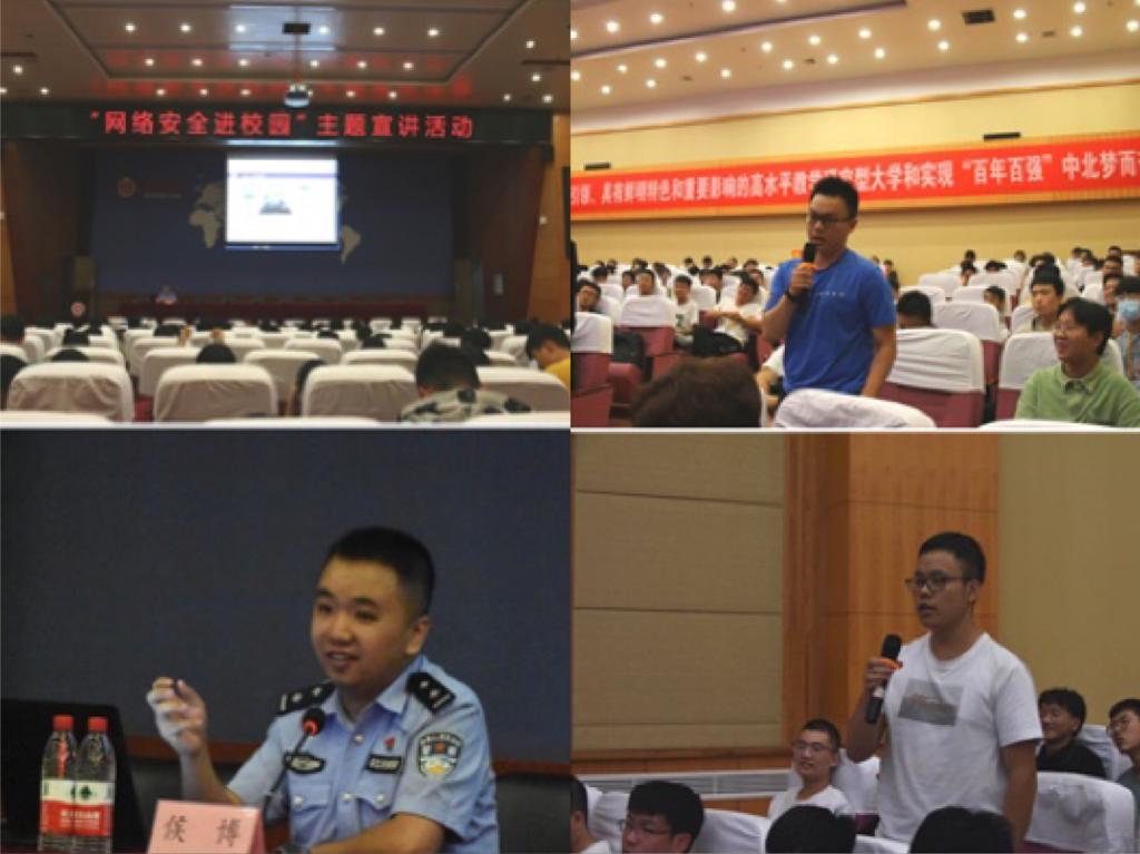 会上,侯博警官通过特殊案例让学生直观的了解网络犯罪的形式多样和犯罪分子的狡猾,告诫同学们要遵守法律法规,学会用法律手段维护自己的合法权益。激励同学们做好网络安全,做好自身网络安全防护,守护祖国网络安全!