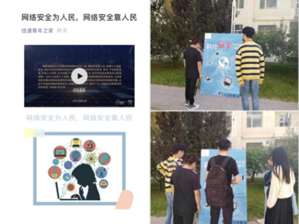 网络提供丰富的信息资源,是学生学习知识、交流思想、休闲娱乐的重要平台;可网络又存在着极大的陷阱和安全隐患。为提升学生的安全防范意识,学院院在宿舍楼下和食堂门口人流量大而集中的位置摆放网络安全宣传画板,并利用学院官方微信公众号“信通青年之家”平台发布网络安宣传视频。