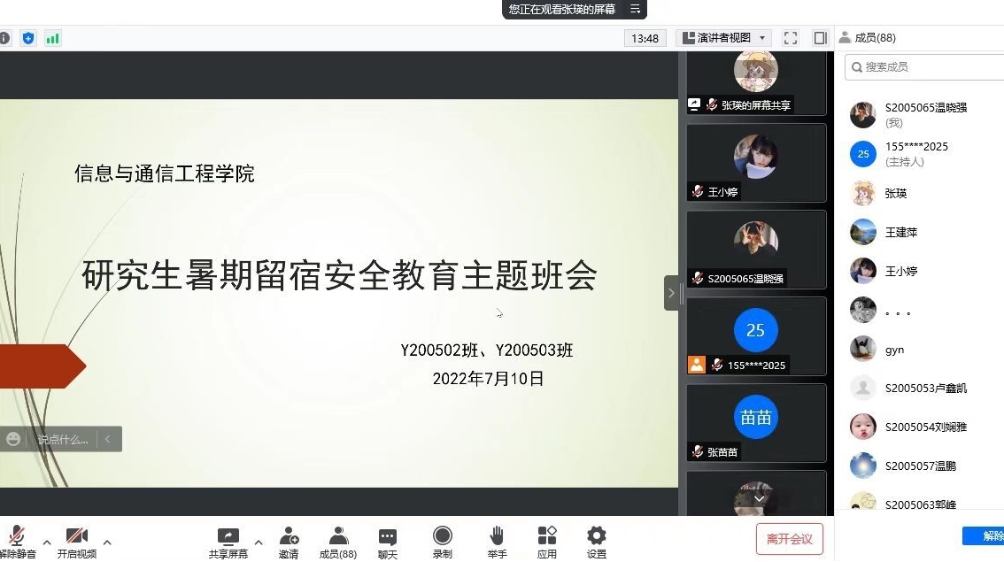 为进一步加强研究生暑期安全教育工作,提高学生安全防护意识,增强学生自我保护能力,避免安全隐患的发生,2022年7月10日,学院组织研究生班级召开暑假安全教育线上主题班会。