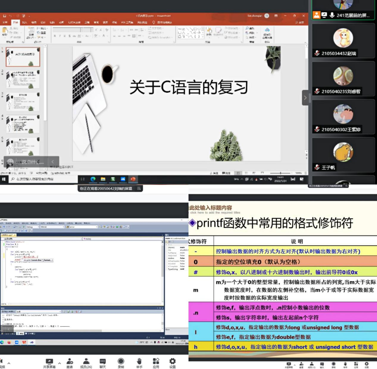 C语言由刘瑞、范展前、刘嘉雨三位同学为大家系统分析了考试重点,并强调上机练习的重要性。首先引导同学们复习了C语言常见结构与有关基本概念,然后通过实际操作为同学们进行演示,其中从多角度剖析到重点步骤强调了相关注意事项,使得同学们能够将概念与实际较为快速地结合,加深了同学们对C语言的理解与运用。