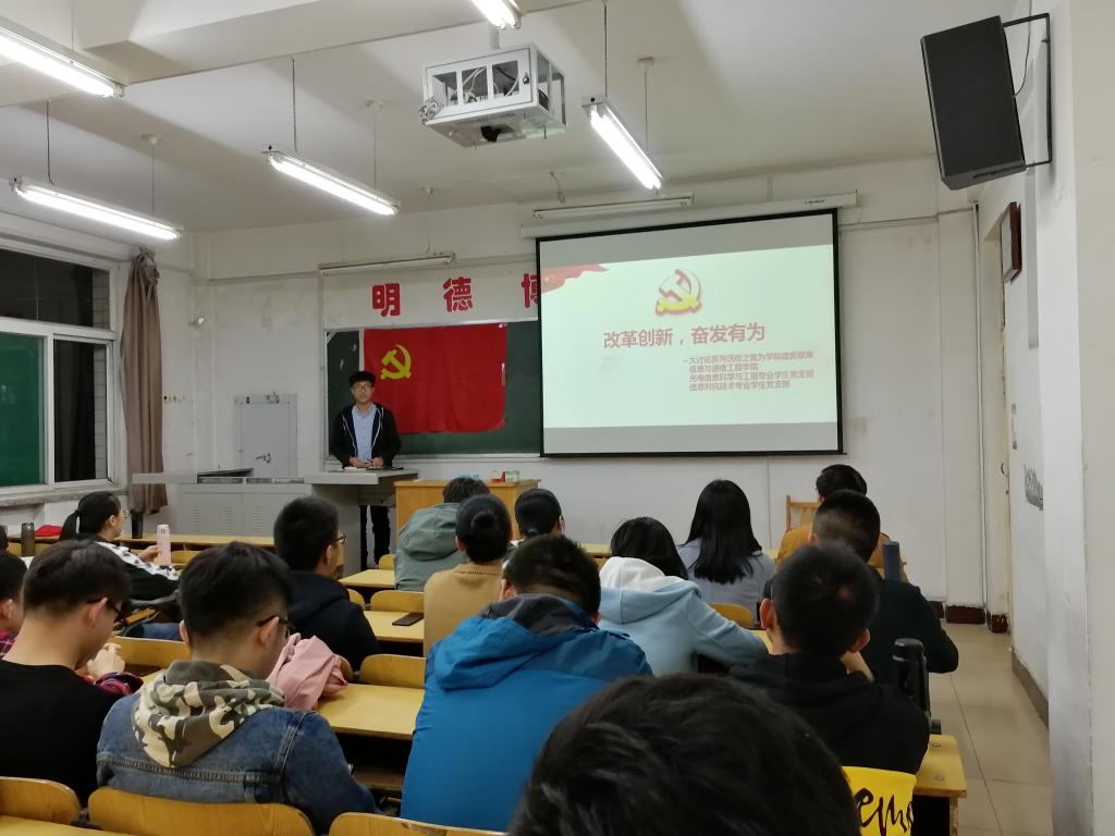 为了扎实推进改革创新,奋发有为”大讨论,2019年42下午国产a片 学生党支部在10206Z教室举办了我为改革创新做什么主题党日活动,会议光电信息科学与工程专业学生党支部副书记余成臻同志主持
