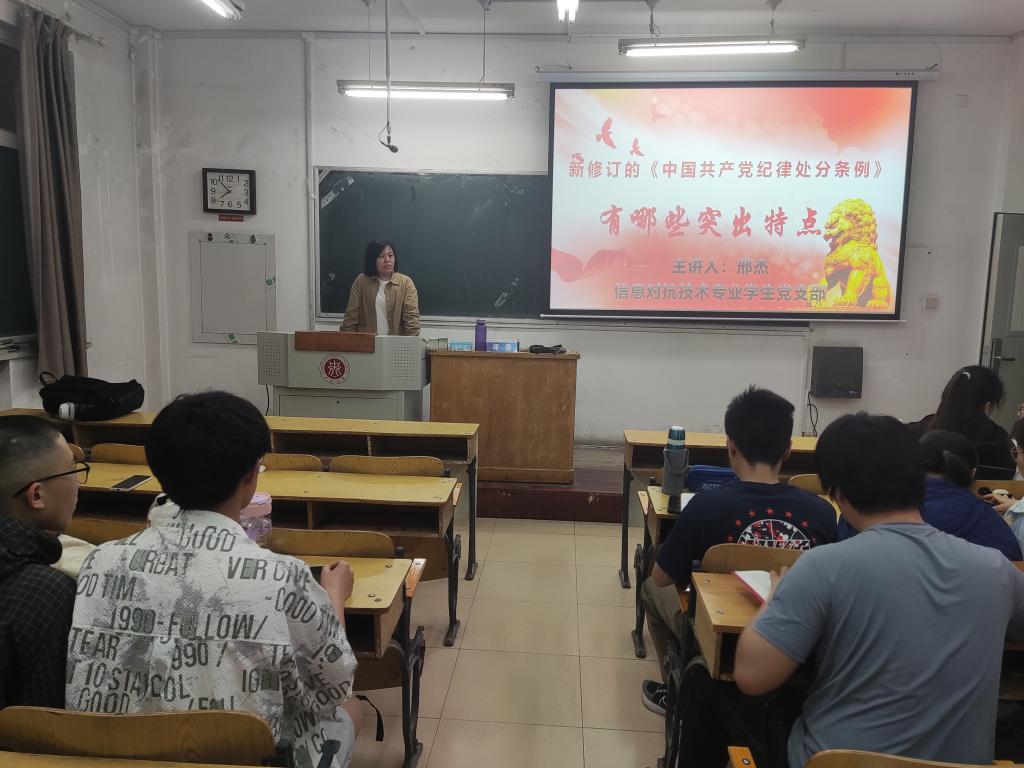 2024年6月5日晚,信息对抗技术专业学生党支部在10209Z开展党纪学习教育专题党课,全体党员参与此次党课培训。