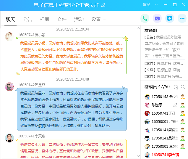 全体党员在支部书记陈淑霞老师的带领下,在支部QQ群里用文字形式作了庄严承诺;每位党员提交了一份《思想汇报》,线上形成了互相鼓励、互相影响的学习氛围,这种形式激励着所有党员牢记初心使命,发挥自己的力量,与祖国共克时艰。