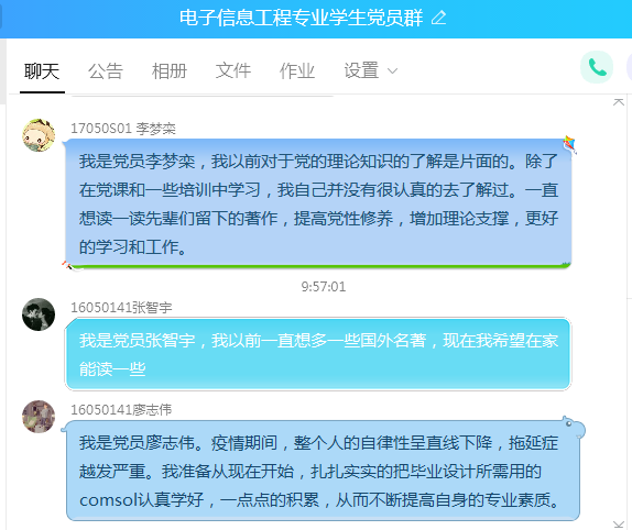 3月18日,电子信息工程学生党支部在院党委的号召下,全体党员在网上一起学习了《总书记回信点赞90后党员,青年反响热烈》、《习近平总书记的回信在北京大学援鄂医疗队全体“90后”党员中引起强烈反响》两篇文章。