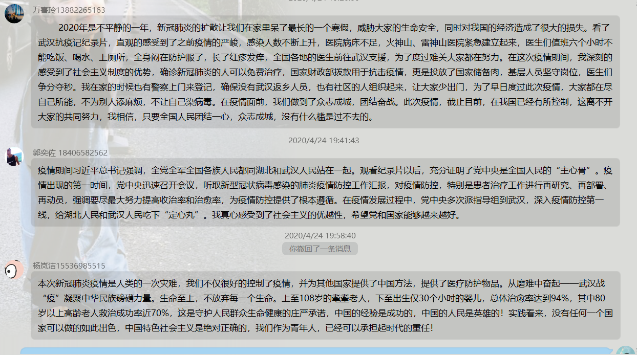 作为信息对抗技术专业学生党支部中的一员,我们虽然可能大多身处于疫情防控的大后方,但并没有忘记身为一名共产党员的义务与责任,保持思想警惕,理性思考,增强“四个意识”、坚定“四个自信”、做到“两个维护”。对此特殊的国际环境,信抗支部的成员们结合纪录片中所讲述的内容,以及疫情期间看到的、听到的人和事,分享了自己的切实感受,讲述出了自己的抗疫故事。大家在分享中互相学习理论知识,吸收先进思想,争做日日有进步的先进党员。