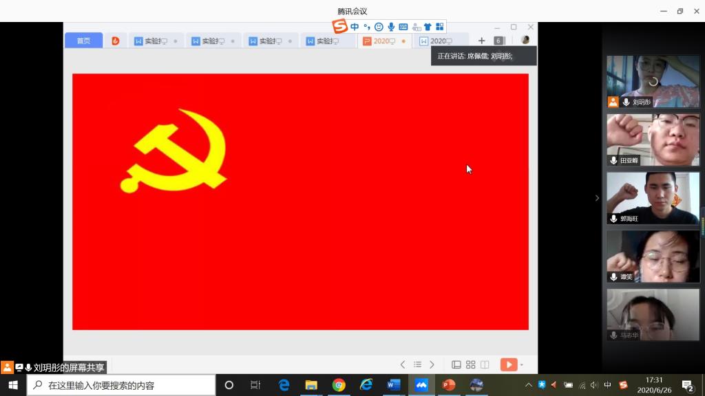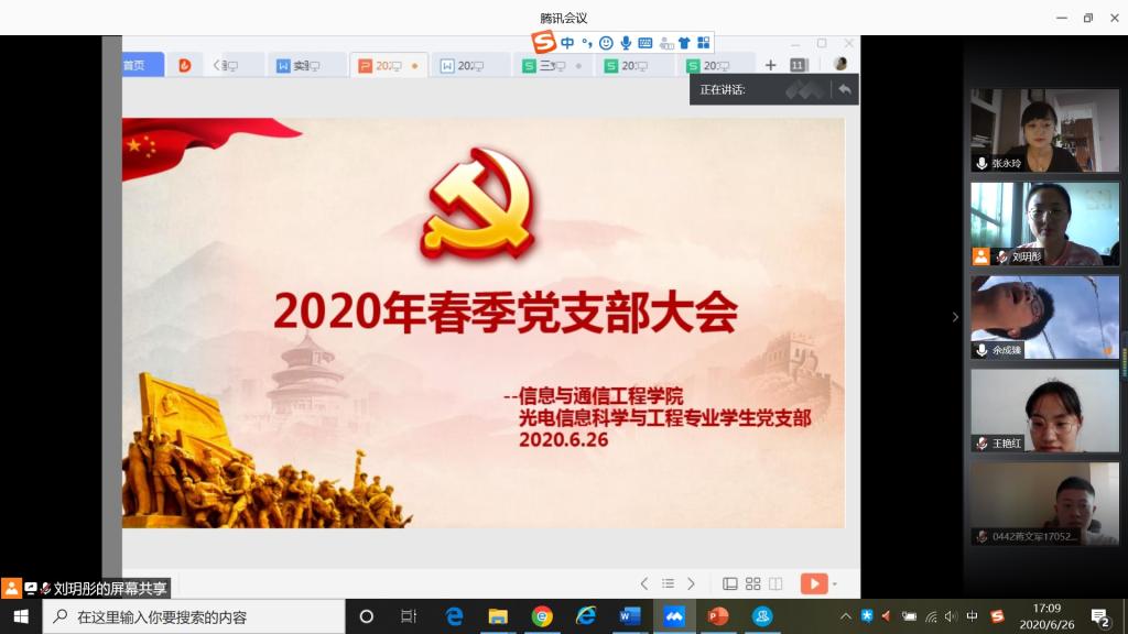 2020年6月26日下午五点,光电信息科学与工程专业学生党支部在腾讯会议平台召开线上党员大会。会议主要讨论关于高虹霞等9位预备党员转正事宜。本次会议由支部书记张永玲老师主持,光电信息科学与工程专业学生党支部全体党员参加会议。