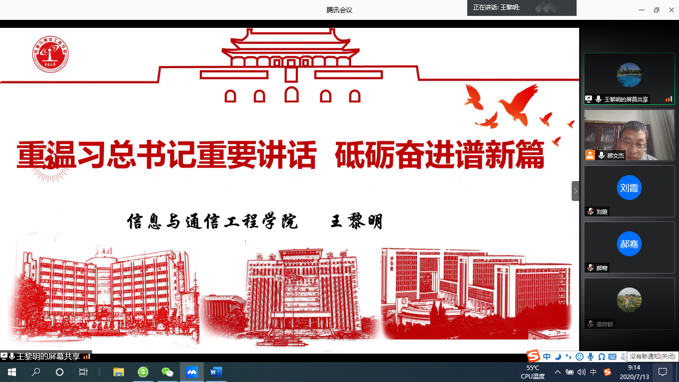 为进一步提高党员思想政治素质,深刻领会习近平总书记视察山西重要讲话重要指示精神,结合当前疫情防控情况,根据院党委安排,2020年7月13日上午9点,学院党委委员王黎明教授为电工电子教工党支部全体党员领学了习近平总书记视察山西重要讲话重要指示。会议由支部书记郎文杰主持,会议形式采用腾讯会议线上集中学习的方式。