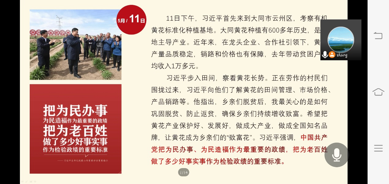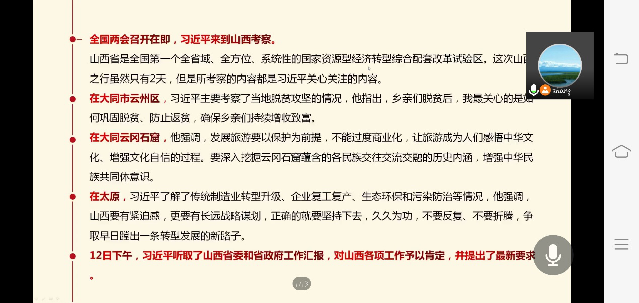 会上张权权主任结合自身的感受,带领大家一起重温了习近平总书记在大同市云州区、大同市云冈石窟和太原的视察的行程和讲话。总书记指出,要把为民办事为民造福作为最重要的政绩,把为老百姓做了多少好事实事作为检验政绩的重要标准;要千方百计巩固好脱贫攻坚成果,把乡村振兴这篇文章做好,让乡亲们的生活越来越美好;要牢固树立绿水青山就是金山银山的理念,坚决打赢污染防治攻坚战,推动山西沿黄地区在保护中开发,开发中保护。总书记的话语,展现了共产党人的责任和担当,这些思想激励着党员们发挥党员先锋模范作用。
