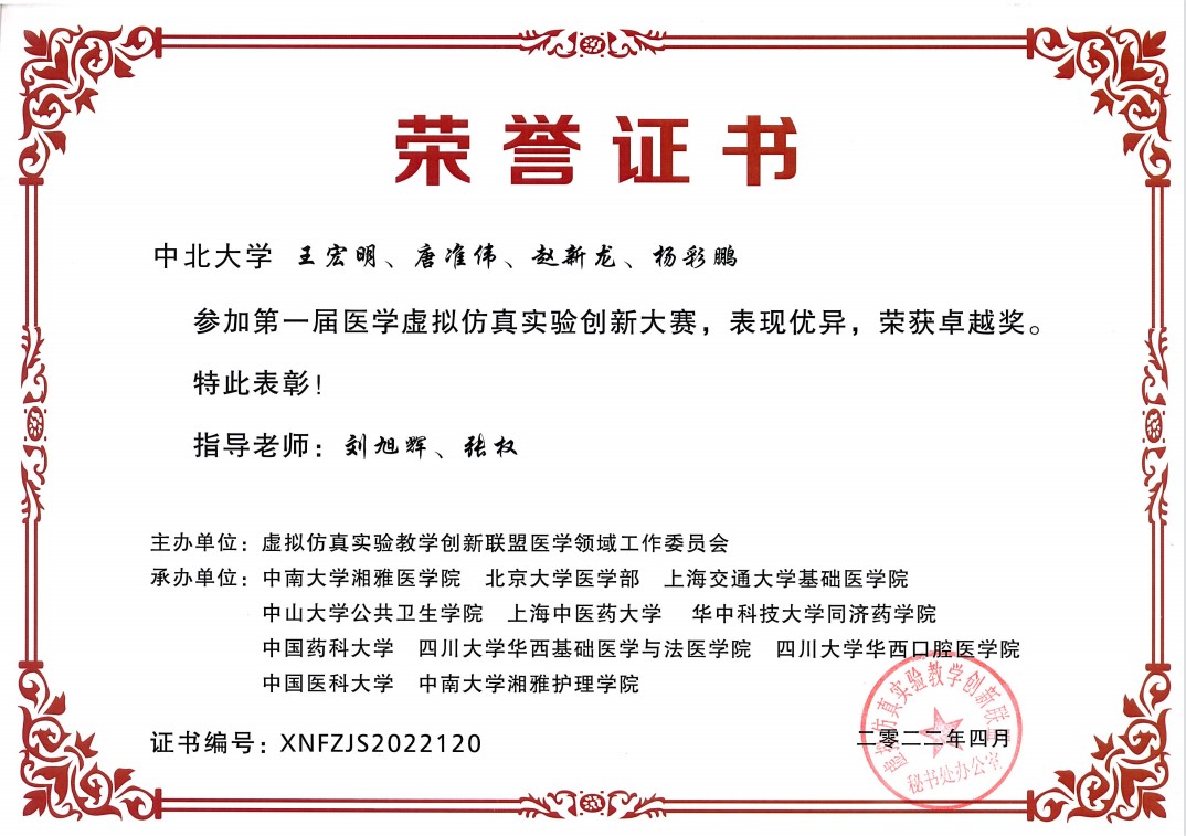 医学虚拟仿真实验创新大赛是我国医学教育界的重大赛事之一,通过此次参赛,不仅展示了学生的专业风采,更是增强了学生“敢闯会创”勇于探索的精神,提高了自主学习和实践能力,增长了智慧才干,锤炼了意志品质,真正达到“以赛促练、以练促学”的目的。同时也为生物医学工程专业深化实验教学改革,探索创新性实验教学模式探出了一条新路,为促进信息技术与医学教育的深度融合,推动跨学科、跨专业之间的交流与合作提供了宝贵经验。
