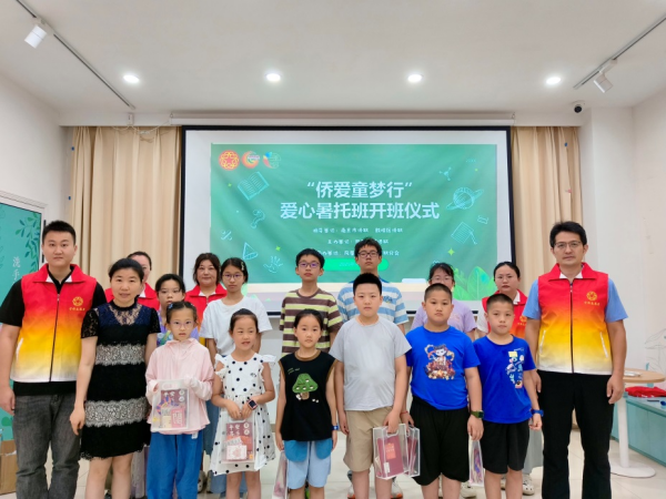 李庭恺为现场青少年发放爱心文具袋,袋内精心准备了笔记本、科普手册及侨史绘本,传递侨界的关怀与期许。孩子们接过文具时的灿烂笑容,成为现场最动人的画面。在热烈的掌声中,“侨爱童梦行”爱心暑托班正式开班,全体人员合影留念,定格这一充满希望的瞬间。